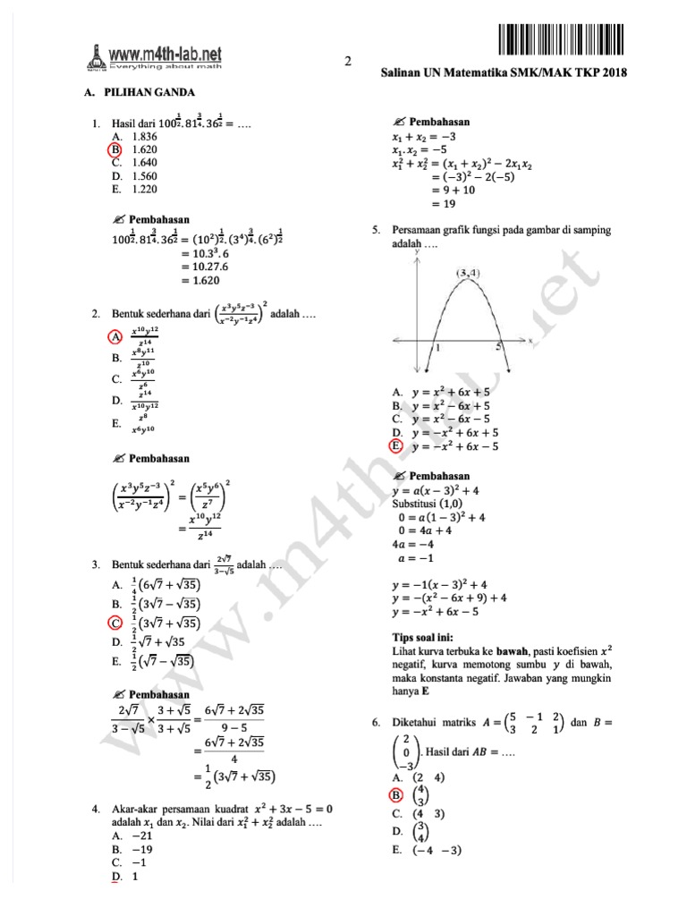 Pembahasan un 2018 smk tkp www m4th lab net pdf 2 salinan un matematika smk mak tkp 2018 a pilihan ganda 1 1 3 pembahasan 1 hasil dari 1002 814 362 course hero.
