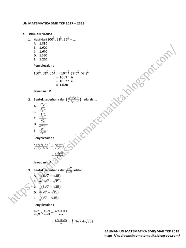 Soal dan pembahasan materi mengalikan bentuk aljabar. Pembahasan unbk smk 2019 tkp p1 www m4th lab net pdf salinan unbk mtk smk tkp paket 1 1 1 jika 4log 3 nilai 64log 3 adalah u2026 a u2212 3 d b e 3 course hero. Soal un smk 2018.namun karena hanya berupa tulisan dan keterbatasan media saya. Kumpulan soal latihan un smk mak 2018 2019 plus kunci jawaban dan pembahasan s r w. Pembahasan soal ujian nasional matematika smk akuntansi pemasaran 2017 2018 bagian 1 no 1.